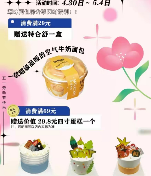 第二波:活动时间2022年4月30日—2022年5月4日,亨源通超市源味面包房专享限时福利开送啦!在源味面包房消费满29元,赠送特仑舒空气牛奶面包一盒,消费满69元,赠送价值29.8元四寸蛋糕一个,爱好甜品的小伙伴们,还不快快行动起来!